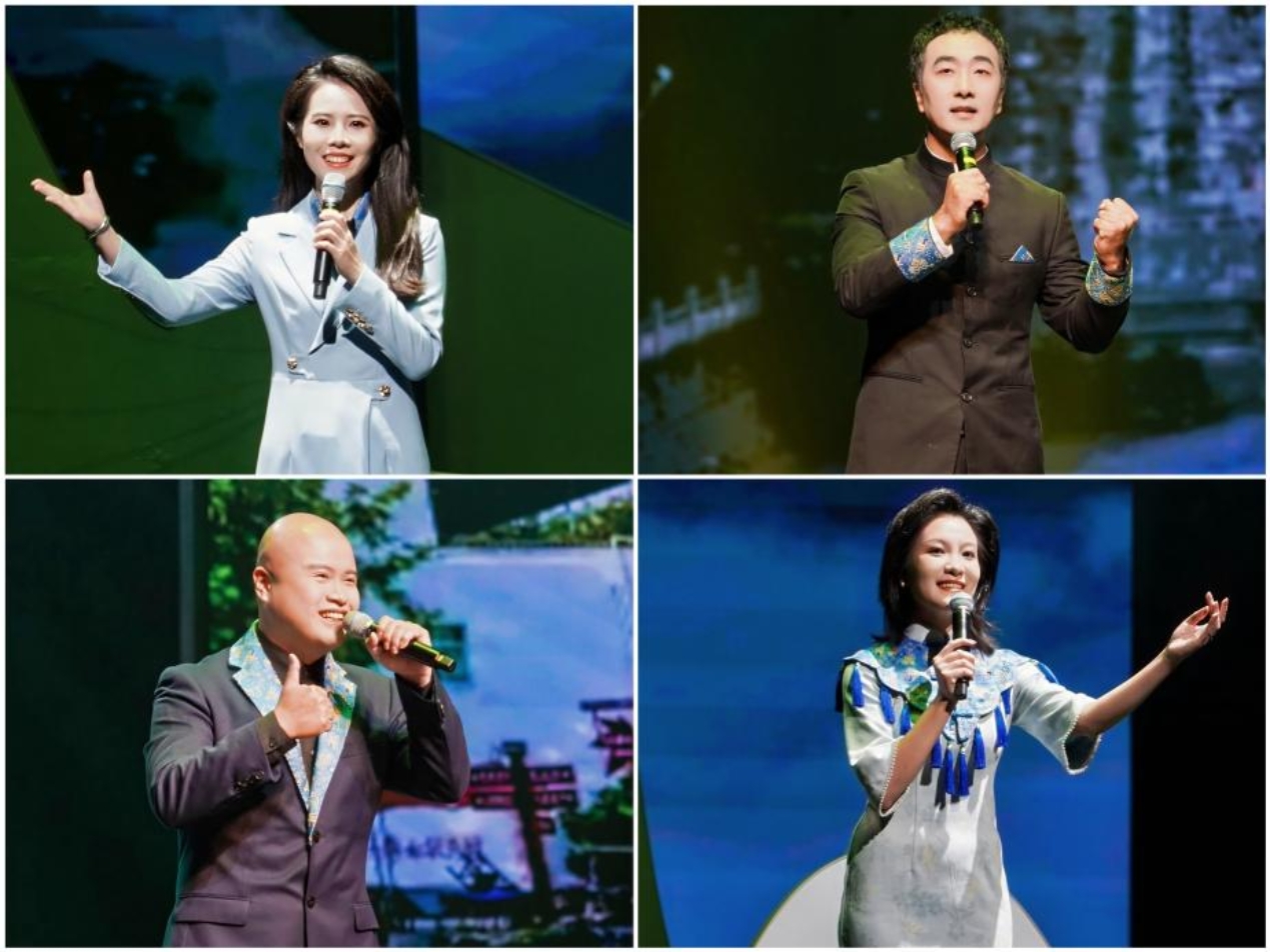 当晚19时30分,展演在浓厚的文化氛围中拉开帷幕。《走读广西·踏诗而行》借历代文人的墨香为引,以千年诗词为舟,巧妙将广西14个城市的自然景观、历史底蕴与文化风情有机串联,呈现一幅“八桂风华尽诗画”的动人长卷。作品从首府南宁邕江的春水绿意启程,至崇左友谊关的巍峨雄关收束,每一座城市都依托经典诗词展开诗意叙事:柳州以柳宗元“江流曲似九回肠”勾勒城江交融的景致,桂林借韩愈“江作青罗带,山如碧玉簪”定格漓江神韵,梧州以元结笔下的“冰井泉香”诉说人文渊薮,北海借汤显祖望涠洲之句展现海洋气象,钦州因齐白石“愿风吹我到钦州”的荔枝情结而更具烟火气息,防城港以“十万山连十万重”彰显边陲壮阔,贺州则依托秀水状元村书院诗句传递耕读传家的优良传统。该作品既是对广西灿烂文化的致敬,也是对“诗与远方”当代实践的生动诠释。它呼吁人们在古诗的引领下走进广西、了解广西,更期待今天的我们以新辞续写广西,用“走”和“读”的独特方式,用脚步、目光与情感继续完成这场跨越时空的文旅对话。