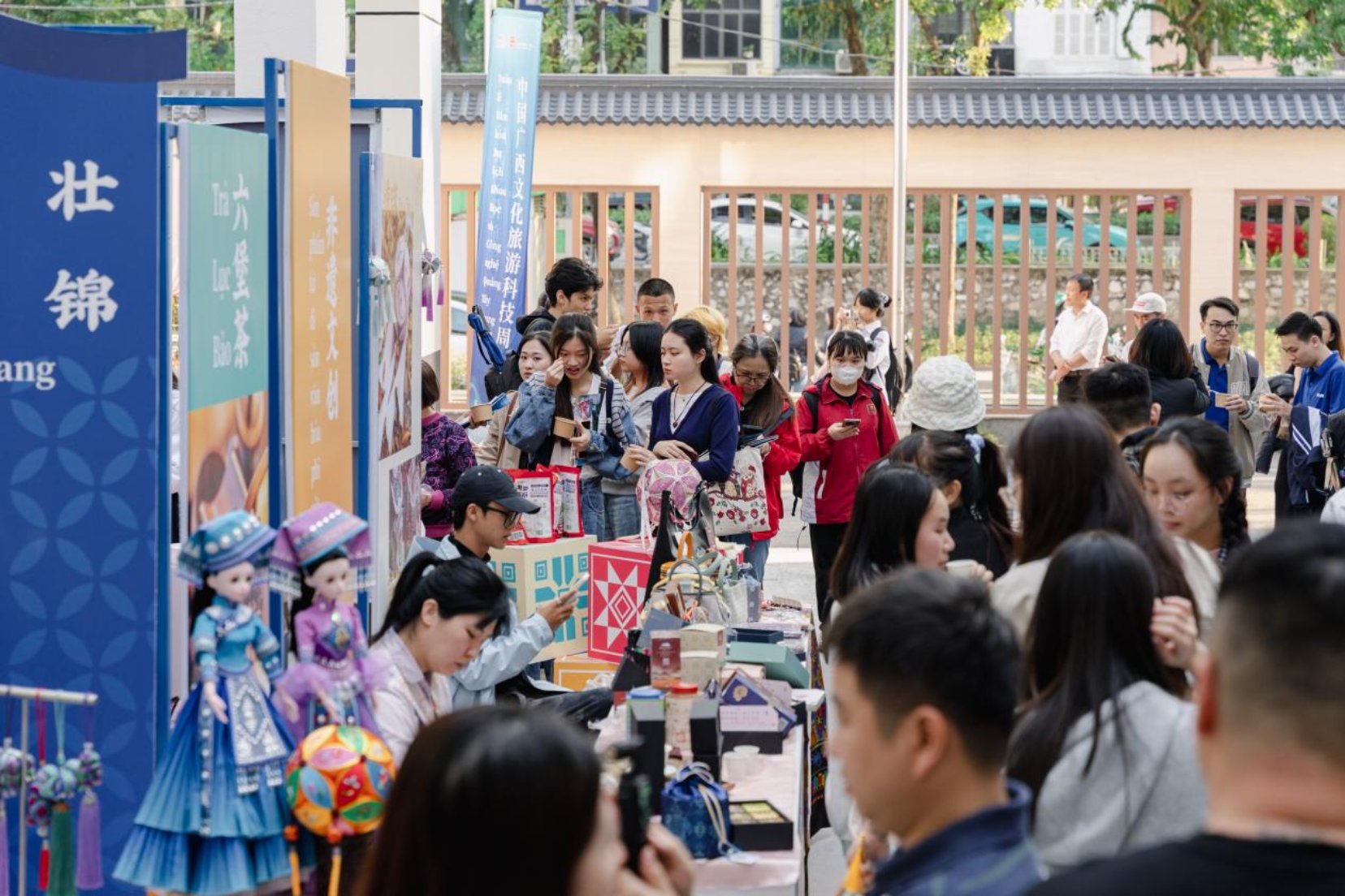广西非遗美食展更是精彩纷呈。在为期三天的展期中,除歌舞表演以外,还有芦笙、侗笛、天琴、马骨胡等广西民族乐器演奏,以及盛装服饰秀等一系列充满广西风情的演出;有六堡茶、坭兴陶、贝雕、壮锦、剪纸、面塑、竹编等七大种类60多款非遗精品,以及拓印、书法、绘画等非遗技艺展示与互动体验;更有广西米粉、柠檬鸭、龟苓膏、酸嘢等十多种特色美食,为现场观众带来最地道的“广西风味”。跨境旅游咨询处同样备受瞩目,吸引了众多观众驻足咨询。在听取广旅集团工作人员的详细介绍后,许多越南观众心动不已,纷纷表示要将广西列入旅行心愿清单。