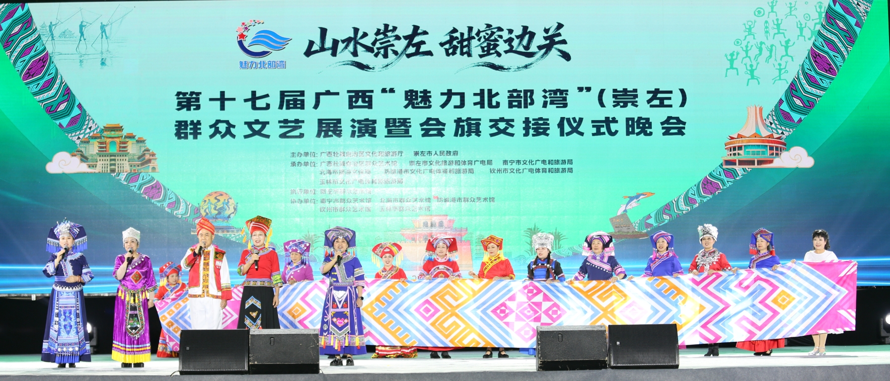 晚会期间,崇左市与钦州市顺利完成了“魅力北部湾”群众文化活动会旗的交接。同时,还举行了2025年广西广场舞展演,由全区14个设区市各推选一支优秀的广场舞队伍参加现场展演活动。展演节目充分体现了广西地方特色民族文化、传承红色文化、东盟文化交融、时代流行、畅想未来等元素。