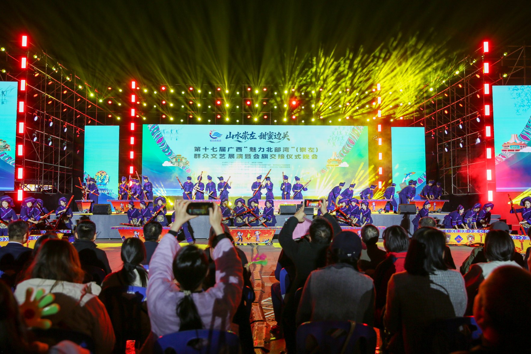 “大舞台”即第十七届广西“魅力北部湾”(崇左)群众文艺展演暨会旗交接仪式晚会。来自崇左、南宁、玉林、北海、防城港、钦州等北部湾城市群部分设区市的艺术团队轮番登台,通过歌曲、舞蹈、朗诵等多种艺术形式,生动展现了新时代广西各族人民的精神面貌与文化自信,为现场观众奉献了一场融合多元文化、极具艺术感染力的视听盛宴。