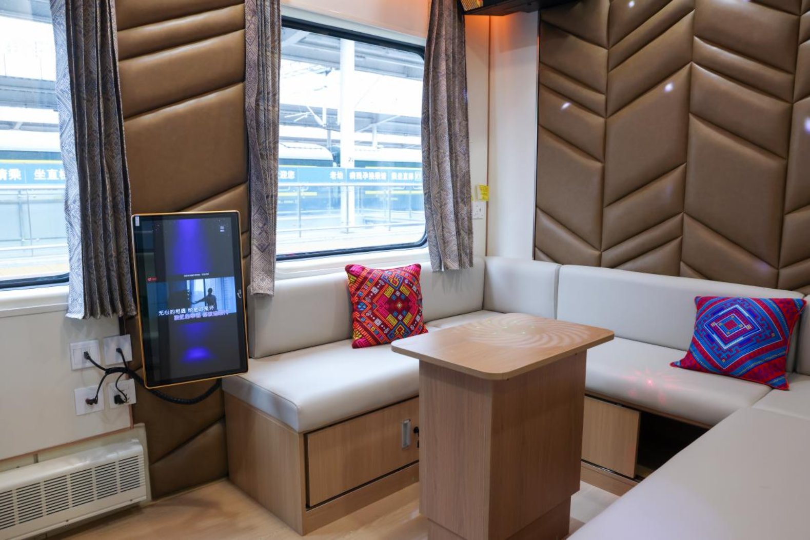 此次开行的“桂行天下”旅游专列,以适老化、舒适化为核心,配备防滑扶手、紧急呼叫系统和随车医护,确保出行安全无忧。当天开行的南宁到南丹旅游专列,首次启用“桂行天下”旅游列车多功能车厢,过道两侧的大型国风白描墙画,展示了侗族风雨桥、德天瀑布、龙胜梯田、桂林象鼻山等广西经典景点;多功能娱乐车厢涵盖KTV、棋牌室、VR影院及休闲吧台,配备的VR体感座椅可提供“飞跃式”旅途体验。在餐车和多功能车厢,窗边贴有壮锦、铜鼓等广西特色贴画海报,还设置了健康科普手册取阅点和广西“老字号”、康养特产展示台,营造出“移动文旅空间”。