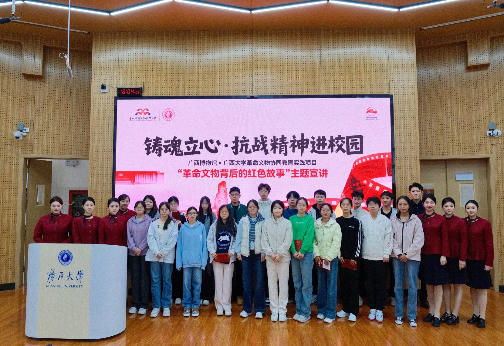 2025年是中国人民抗日战争暨世界反法西斯战争胜利80周年,传承弘扬伟大抗战精神、激活革命文物时代价值成为重要时代课题。在自治区文化和旅游厅革命文物处的统筹指导下,广西博物馆与广西大学于今年9月至12月联合开展“铸魂立心・抗战精神进校园”革命文物协同教育实践项目。项目以“革命文物+高校思政”深度融合为核心,创新构建“政策引领、馆校联动、师生共建、知行合一”的育人新模式,为全国革命文物资源赋能思政教育提供了可复制、可推广的广西范本。