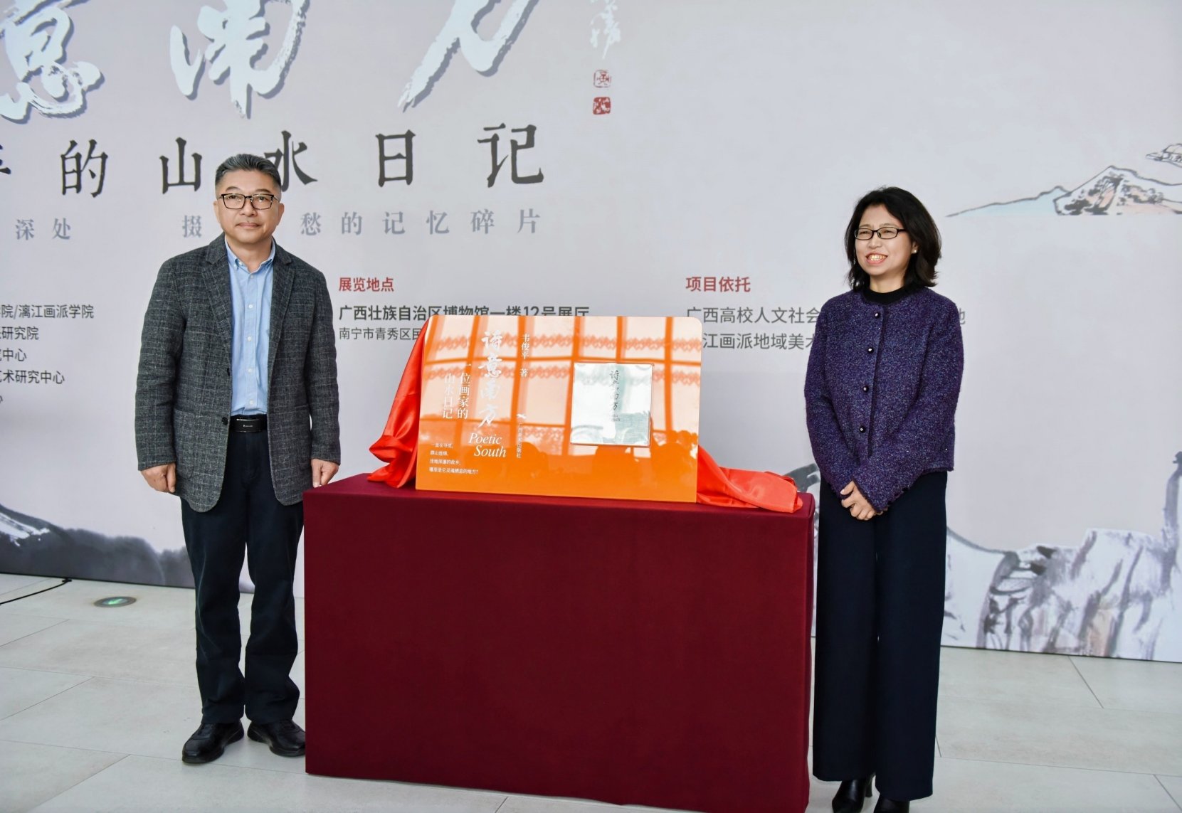 广西美术出版社社长白竹林与韦俊平为展览同名画册《诗意南方——一位画家的山水日记》揭幕