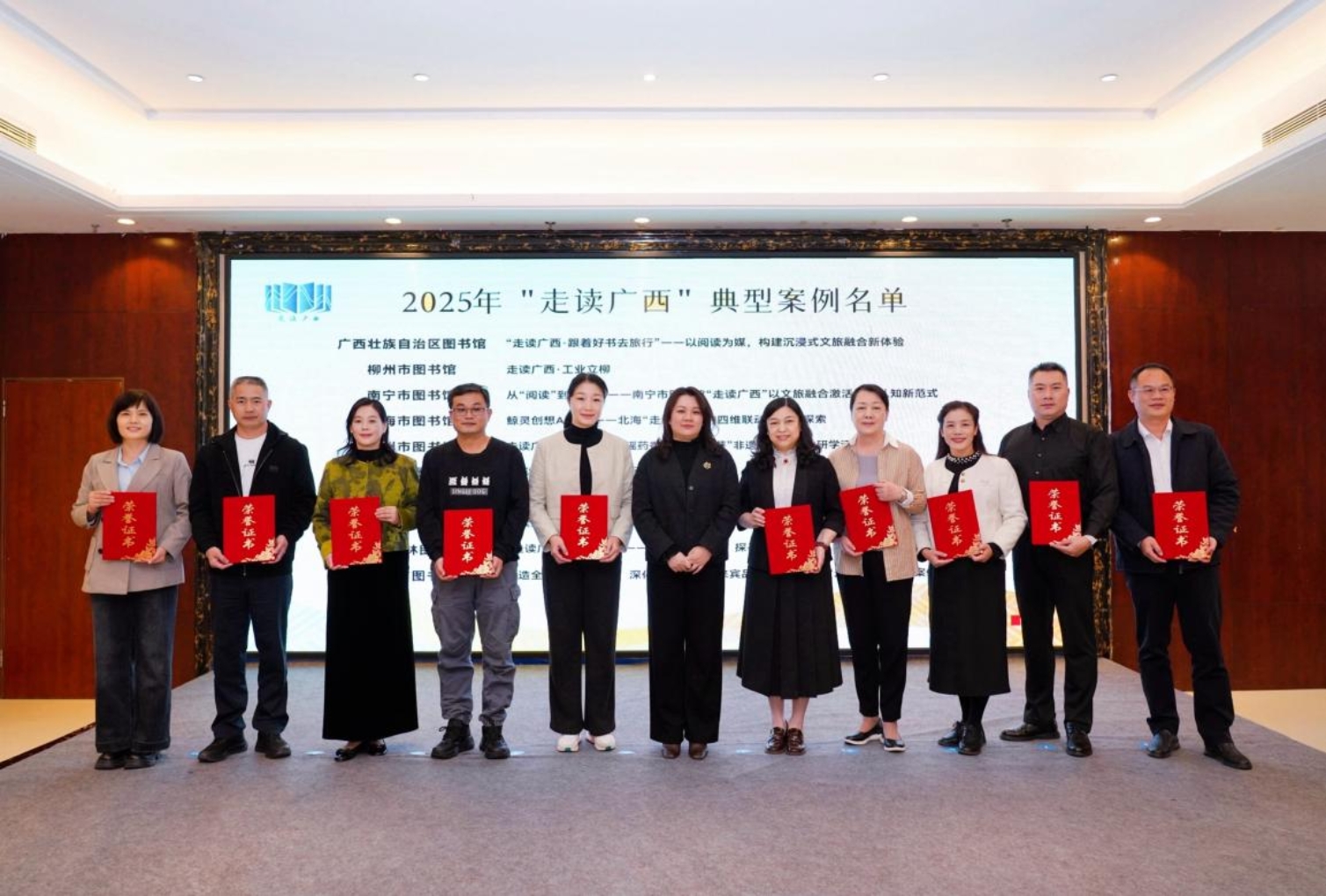 2025年,全区各级公共图书馆善于探索、敢于创新,积极广泛开展“走读广西”系列活动,涌现出一批典型案例,有力推动了文旅深度融合与全民阅读高质量发展。会议对2025年度涌现出的创新实践典范进行了表彰。广西图书馆、柳州市图书馆、南宁市图书馆、北海市图书馆、贺州市图书馆、钦州市图书馆、百色市图书馆、贵港市图书馆、桂林图书馆、来宾市图书馆等10家单位的案例荣获“2025年‘走读广西’典型案例”称号。自治区文化和旅游厅二级巡视员何晓萍为获奖单位颁发了证书。