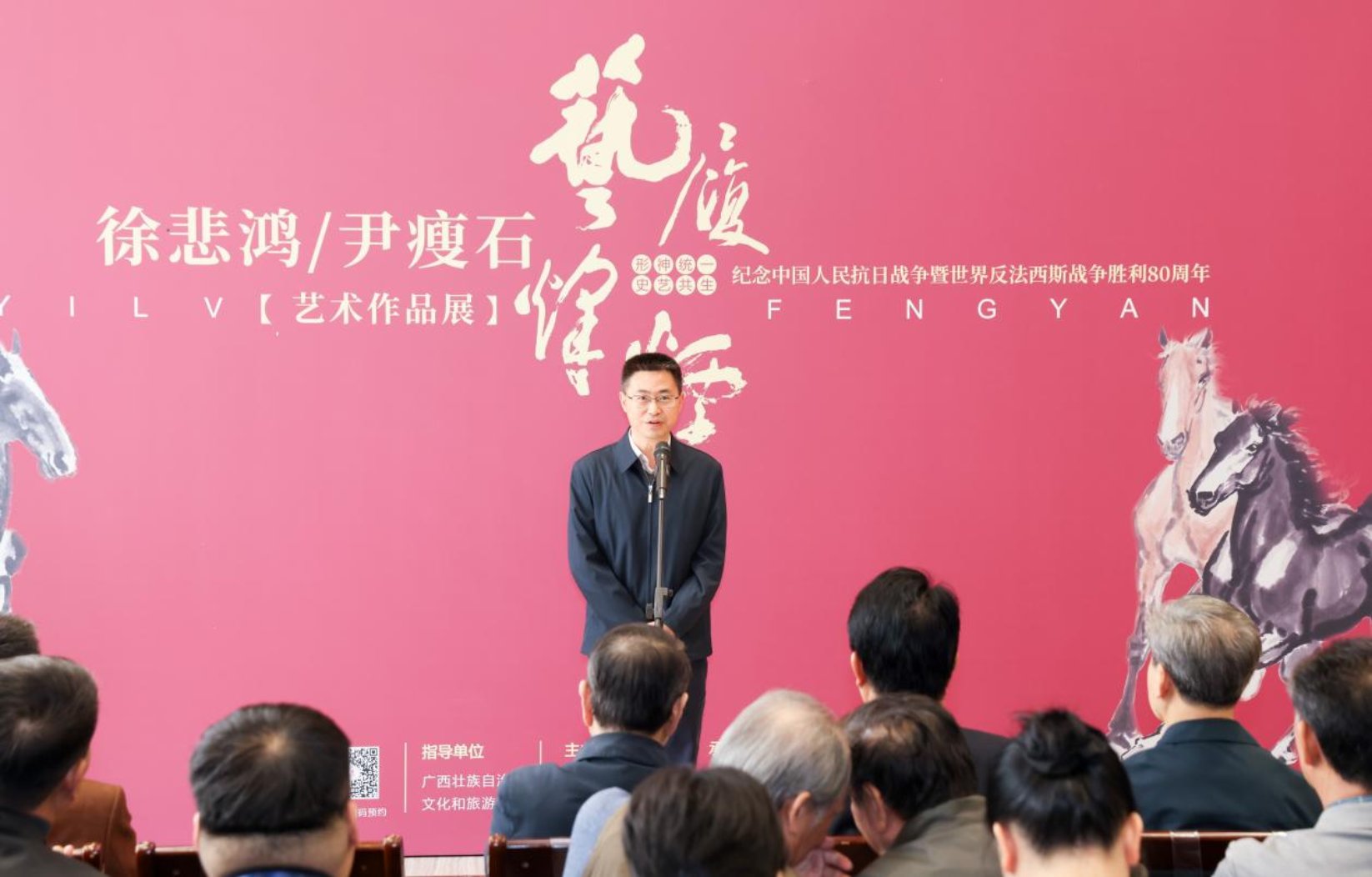 尹瘦石先生家属代表尹汉胤深情回顾了先辈的艺术人生与赤忱情怀,并对展览的精心筹备表示感谢。江苏省徐悲鸿研究会理事蔡力武现场宣读了中国美术家协会秘书长王平发来的贺信。广西艺术学院副校长伏虎在致辞中强调了本次展览对艺术教育与学术研究的重要价值,认为两位大师“艺为人民”的实践是生动的典范。