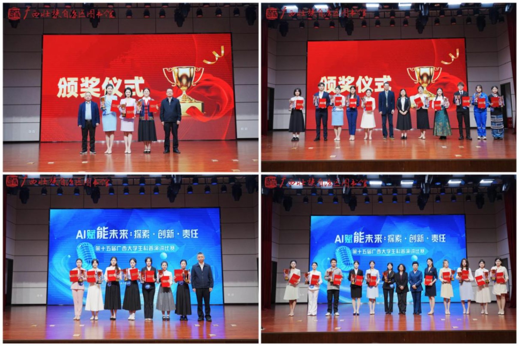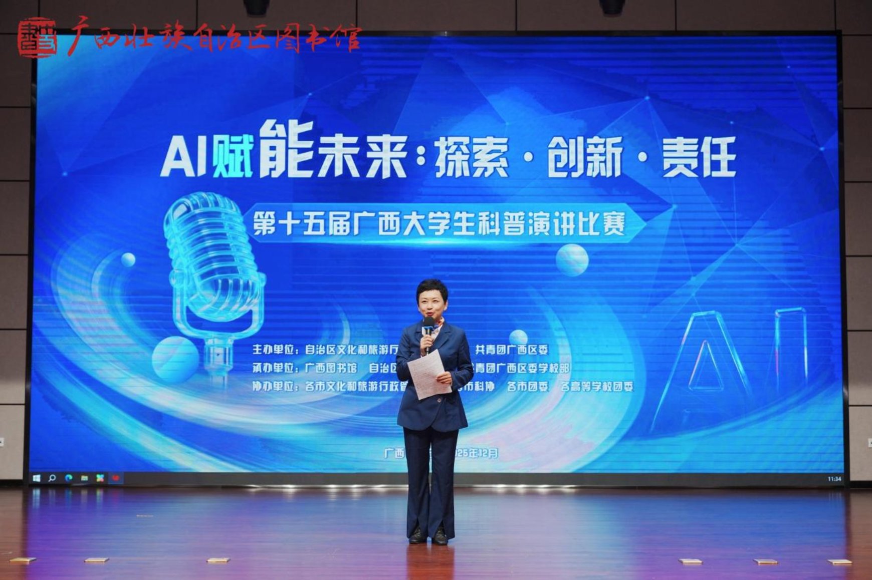 12月21日上午,“AI赋能未来:探索·创新·责任”——第十五届广西大学生科普演讲比赛决赛在广西图书馆举行,并通过广西图书馆微信视频号全程直播。来自全区28所高校的32名选手从初赛中脱颖而出,会聚决赛舞台,围绕人工智能的技术前沿、应用实践与社会责任展开精彩演讲与思想碰撞。