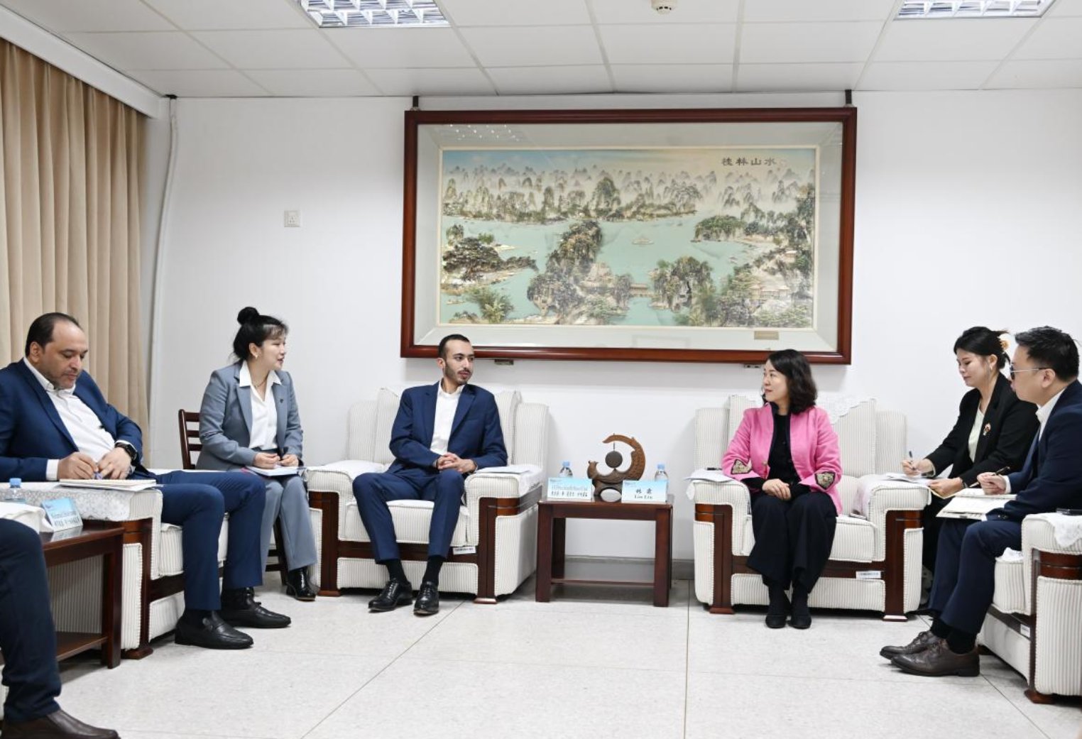 林霖对代表团到访表示热烈欢迎,详细介绍了广西“老、少、边、山、海、寿”六大核心文旅资源,重点分享了广西“人工智能+文旅”领域的创新应用成果。她指出,广西与沙特文旅资源互补性强、合作潜力广阔,为此提出三点合作倡议:搭建常态化文旅推介平台、联合开发跨境精品旅游线路、深化旅游业界务实合作,并明确表示,自治区文化和旅游厅将为沙特第一旅行集团在桂开展业务合作提供政策指导与支持。