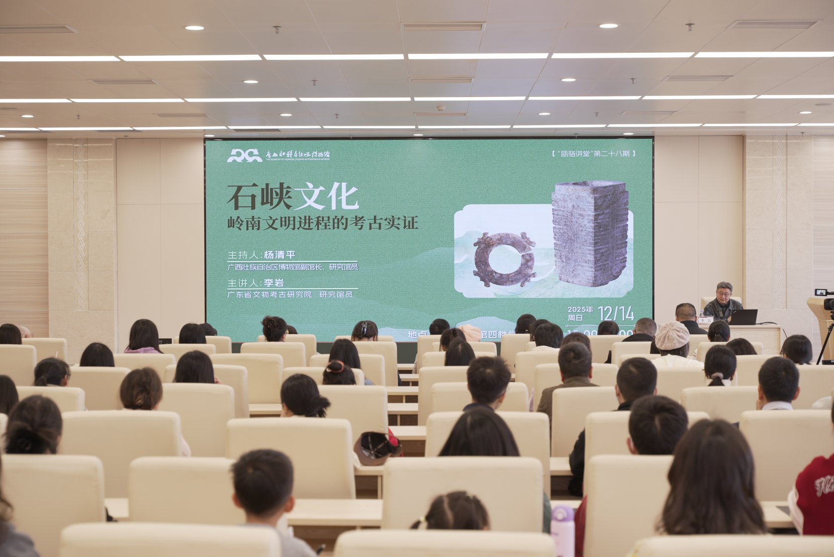 12月14日下午,广西博物馆“瓯骆讲堂”第二十八期在该馆四楼多功能厅举行。本期讲座特邀广东省文物考古研究院研究馆员、著名考古学家李岩老师,作题为《石峡文化:岭南文明进程的考古实证》的精彩演讲,吸引了众多文博界同仁、高校师生及历史文化爱好者到场聆听。