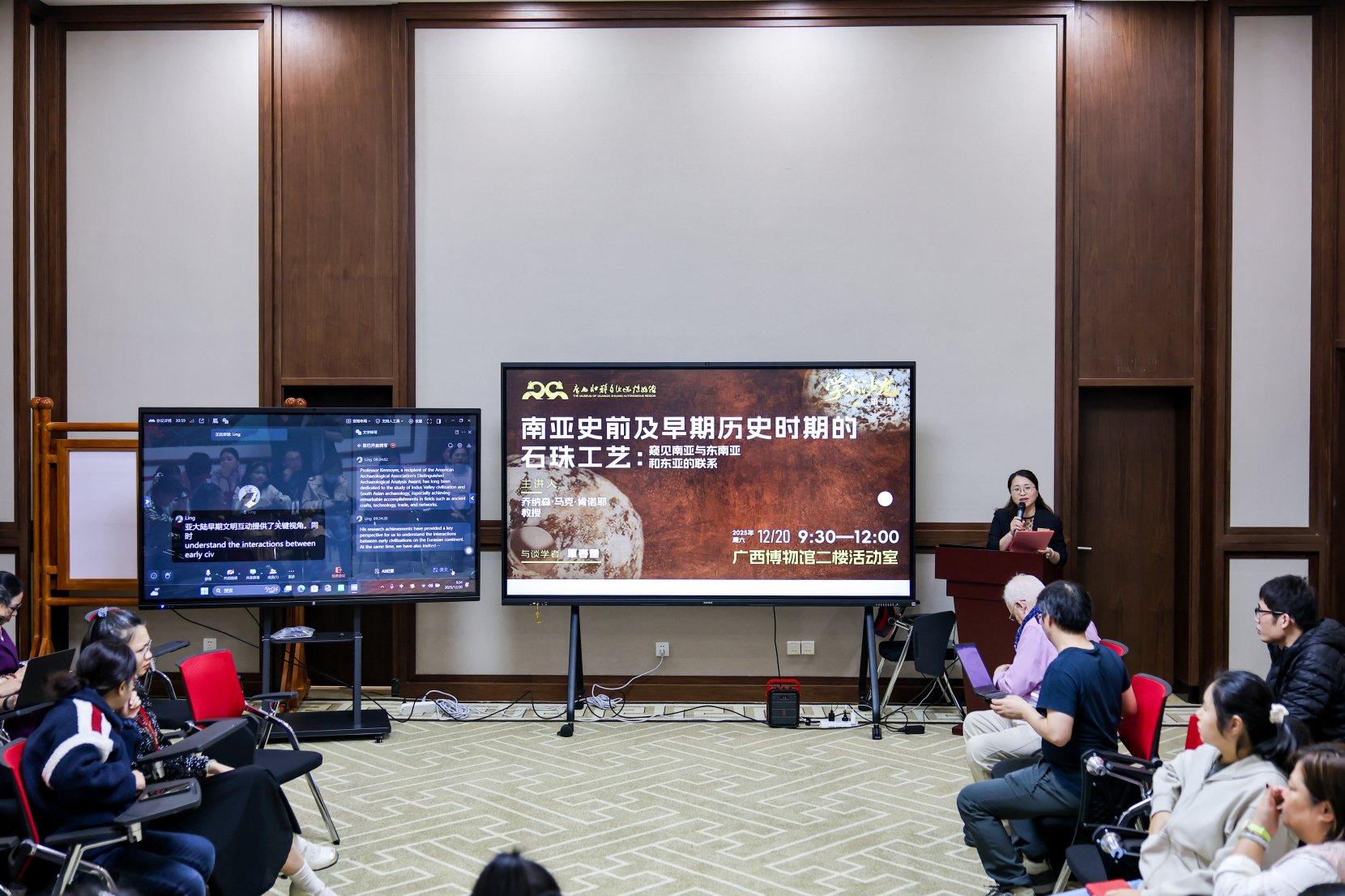 12月20日上午,广西博物馆第一期学术沙龙在馆内举行。本期沙龙主题为“南亚史前及早期历史时期的石珠工艺:窥见南亚与东南亚和东亚的联系”,特邀美国威斯康星大学麦迪逊分校人类学系戴尔讲席教授、美国文理科学院院士、美国考古协会卓越考古分析奖得主乔纳森·马克·肯诺耶(Jonathan Mark Kenoyer)担任主讲嘉宾,并邀请独立学者覃春雷作为与谈学者。活动吸引了来自区内多所高校、文博机构的专家学者及广大文博爱好者参与,现场学术氛围浓厚。