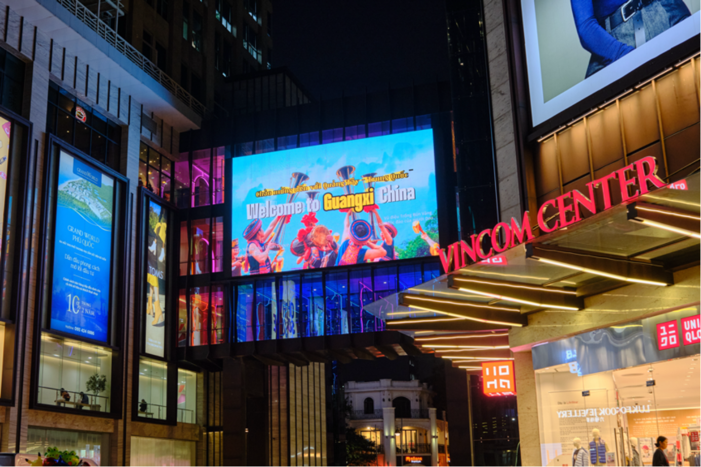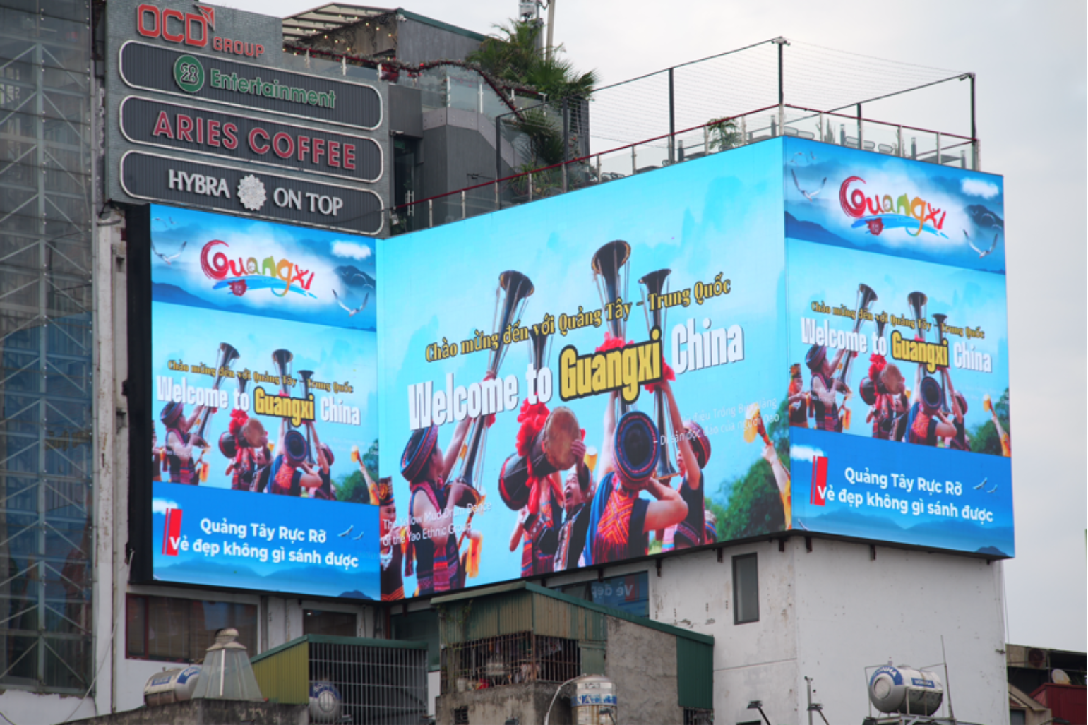 在越南河内,广西文旅广告精准投放在毗邻胡志明博物馆、河内火车站等地的交通枢纽和市内核心商圈,通过动态、直观的户外视频广告,将广西秀美的自然风光、浓郁的民族风情和丰富的旅游资源,生动地展现在河内市民面前,吸引了众多路人驻足观看。