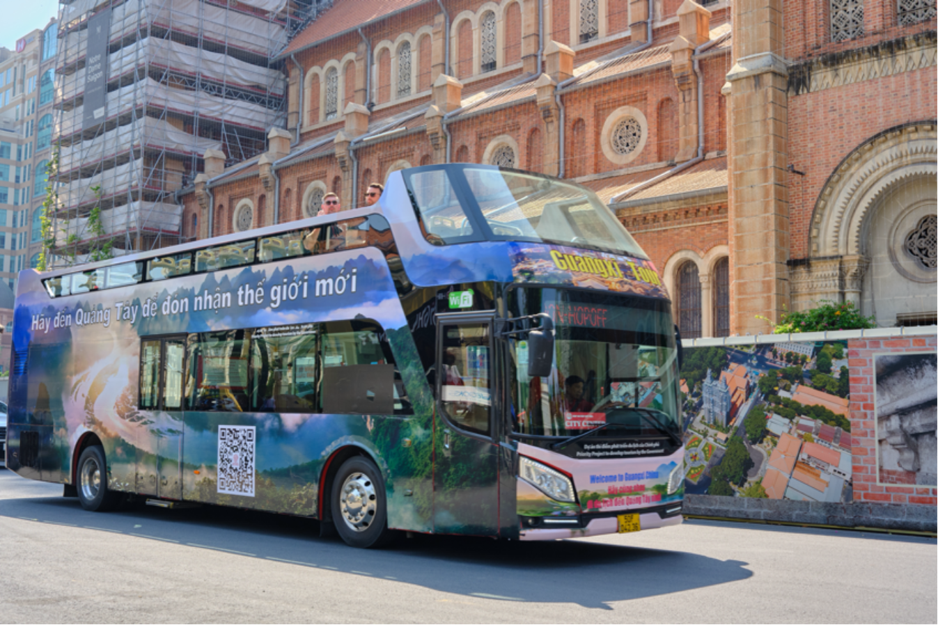 在越南胡志明,穿行于城市核心地带的双层观光巴士,化身为流动的“广西画卷”。车身绘制的广西山水景观,吸引了沿途胡志明市民和外国游客的目光,人们自发拍照打卡,在社交媒体上引发二次传播。在越南吞吐量最大的胡志明市新山国际机场,通过在高人流量区域投放广西文旅视频广告,第一时间向各国游客与商务人士传递广西独特魅力,有效触达潜在客源群体。