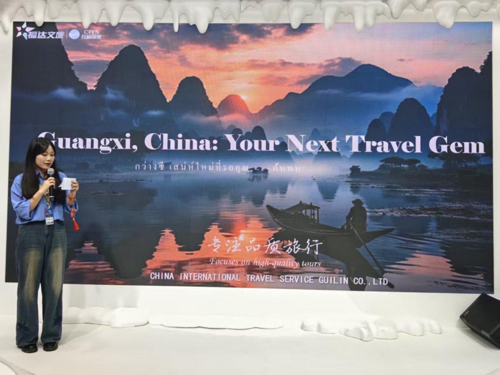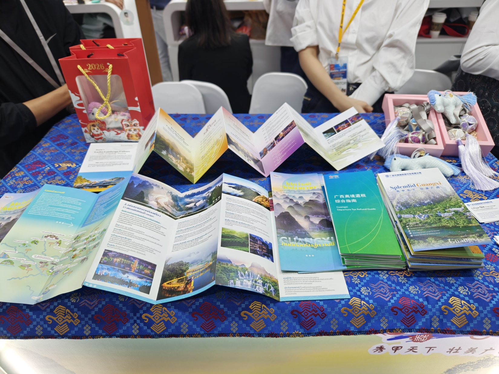 本次广西展台以“秀甲天下 壮美广西”为主题,通过图片和视频循环展示广西文旅资源,辅以绣球、壮锦等装饰,营造广西自然风光和民族风情融合之美。现场摆放的泰语版广西文旅宣传册、多语种广西离境退税综合指南及精品旅游线路手册等,吸引大量游客驻足问询,多家国际旅行商与参展企业进行洽谈对接,期间累计发放各类宣传资料2000余份,为广西持续深耕泰国客源市场、拓宽合作渠道奠定基础。