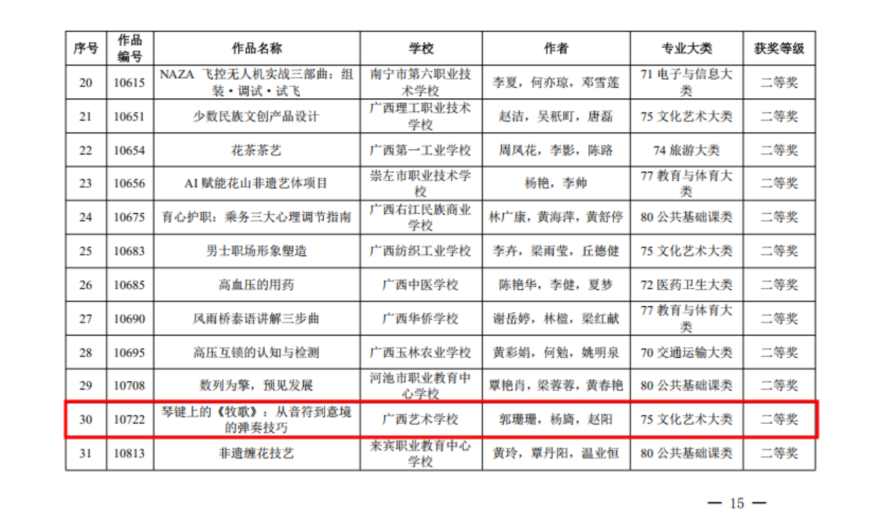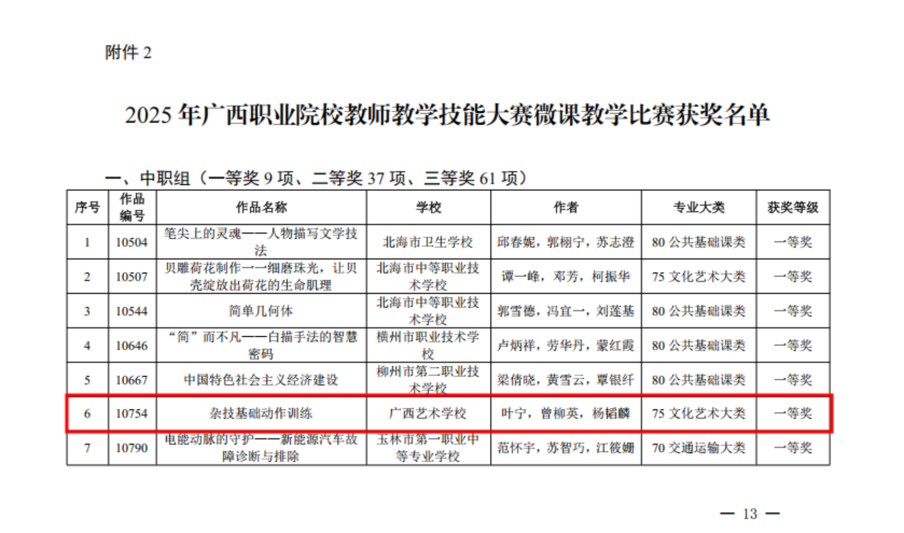 近日,自治区教育厅公布2025年广西职业院校教师教学技能大赛混合式教学比赛及微课教学比赛获奖名单,广西艺术学校教师团队凭借扎实的教学功底与创新的教学设计脱颖而出,在微课教学比赛中喜获双奖,彰显学校艺术职业教育的教学实力和育人成效。