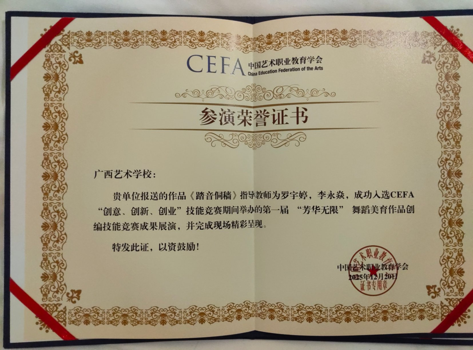 近日,由中国艺术职业教育学会主办的第一届“芳华无限”舞蹈美育作品创编技能竞赛展演在江苏无锡落下帷幕,广西艺术学校原创舞蹈作品《踏音侗穑》(指导教师:罗宇婷、李永焱、许蓉蓉)在竞赛中荣获二等奖,并入选本次展演,彰显了中职舞蹈教育的鲜明特色与强劲实力。