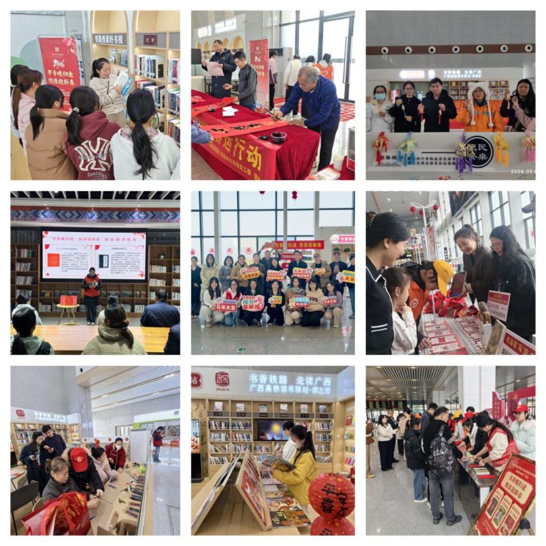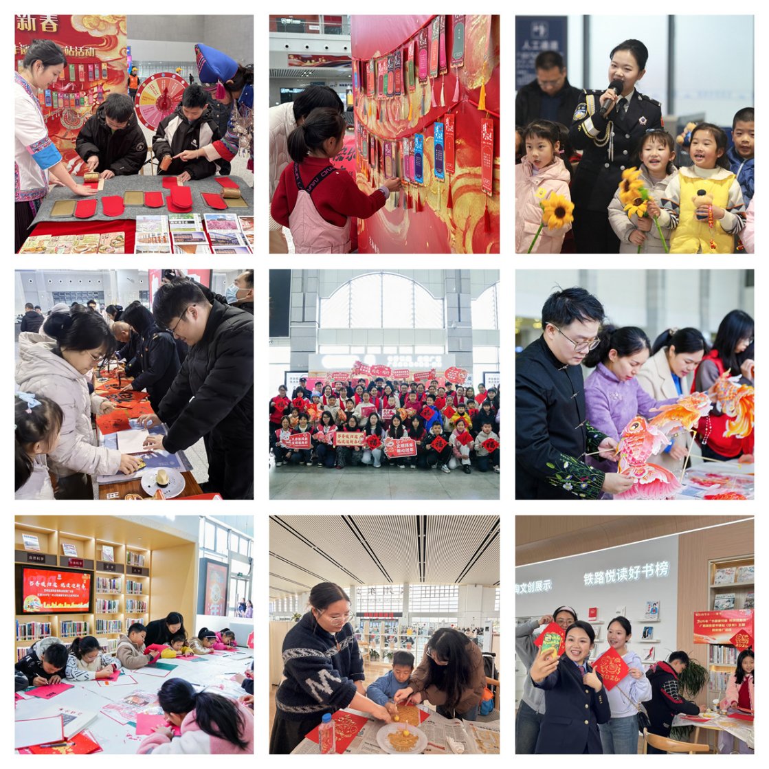 为营造喜庆祥和的新春氛围,2月2日春运首日,广西图书馆联合中国铁路南宁局集团有限公司党委宣传部,联动全区市级及以上公共图书馆,在广西14个高铁读书驿站同步开展“书香暖归途 悦读迎新春”主题阅读推广活动。活动依托广西高铁读书驿站“阅读·悦行”品牌,将地方文脉、非遗技艺与新春年味深度融合,为春运旅途注入深厚的文化底蕴。活动共吸引3万余名旅客热情参与。