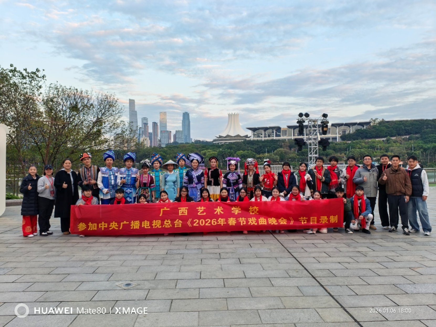 金蛇曼舞辞旧岁,骏马奔腾迎新春。丙午马年大年初二晚(2月18日)20时,《2026年春节戏曲晚会》在央视综合频道(CCTV-1)、戏曲频道(CCTV-11)黄金档首播,并在综艺频道、戏曲频道重播,央视频、央视新闻、央视文艺、央视网、云听等平台同步上线。广西艺术学校学子受邀参与节目《雏凤新声》录制(晚会第12个节目),于主会场南宁市民歌湖精彩亮相,为全国观众献上一场融合传统戏曲与民族风情的文化大餐。