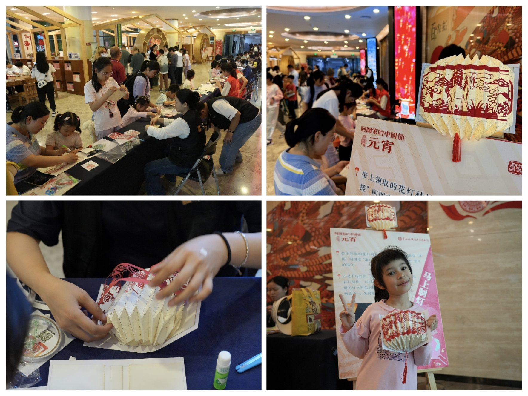 阅览大楼文化长廊里,非遗技艺让古老的节日焕发新生。阿图家专属的“滚马”“神马”剪纸花灯成为当晚的“明星”。花灯制作区,读者围坐在指导老师身旁,专注地折叠、裁剪、粘贴,一个个书本造型的花灯在掌心点亮,暖黄的光透过纸面洒落,让剪纸也有了温度。