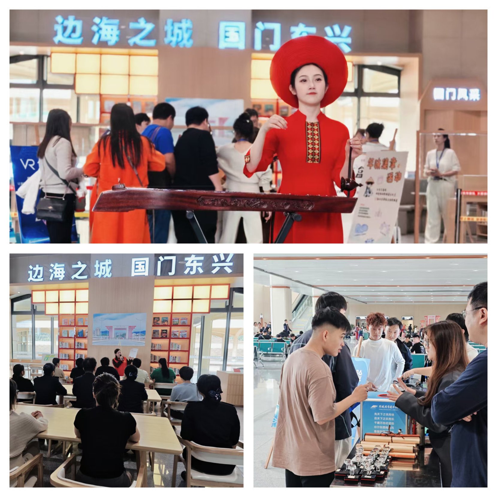 活动现场,各类特色活动精彩上演,将阅读服务和边境文化展示深度融合,带领旅客沉浸式感受国门文化韵味。活动邀请了独弦琴非遗传承人演奏边境特色曲目,讲解独弦琴的历史渊源与传统制作工艺,展现独弦琴的魅力;图书馆员结合东兴万尾金滩、东兴口岸、“大清国钦州界”五号界碑等旅游打卡点开展图书推荐,解读地方人文历史与自然风貌景观,让旅客在候车间隙领略边境风情。此外,现场设置特色盖章打卡环节,精选16枚防城港地标图案印章,以新颖的互动形式吸引了众多旅客踊跃参与,为旅途留下独特的边境文化印记。