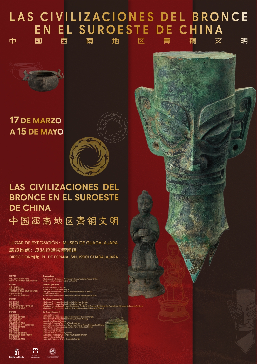 3月17日,“中国西南地区青铜文明”展在西班牙瓜达拉哈拉博物馆开幕。广西博物馆馆藏的鎏金铜面具、羊角钮铜钟、提梁铜鼎、刻花三羊钮铜簋、兽足三羊钮弦纹铜樽五件青铜文物惊艳亮相。