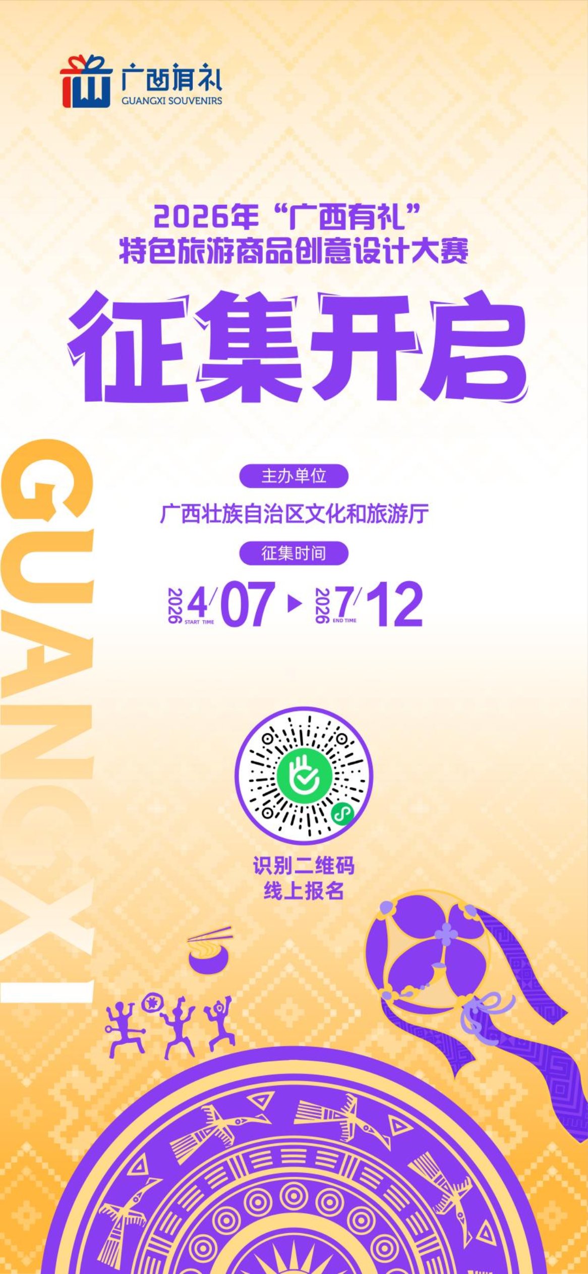 桂风融创意,好物礼八桂!由广西壮族自治区文化和旅游厅主办的2026年“广西有礼”特色旅游商品创意设计大赛,即日起开启作品征集!