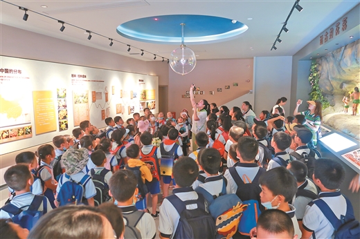 近日,一群小小研学家走入桂脉展厅,讲解员让大家寻找一颗上万年的桂花种子。孩子们找了一会儿,才发现它就静静地贮存在头顶的小小星球里。