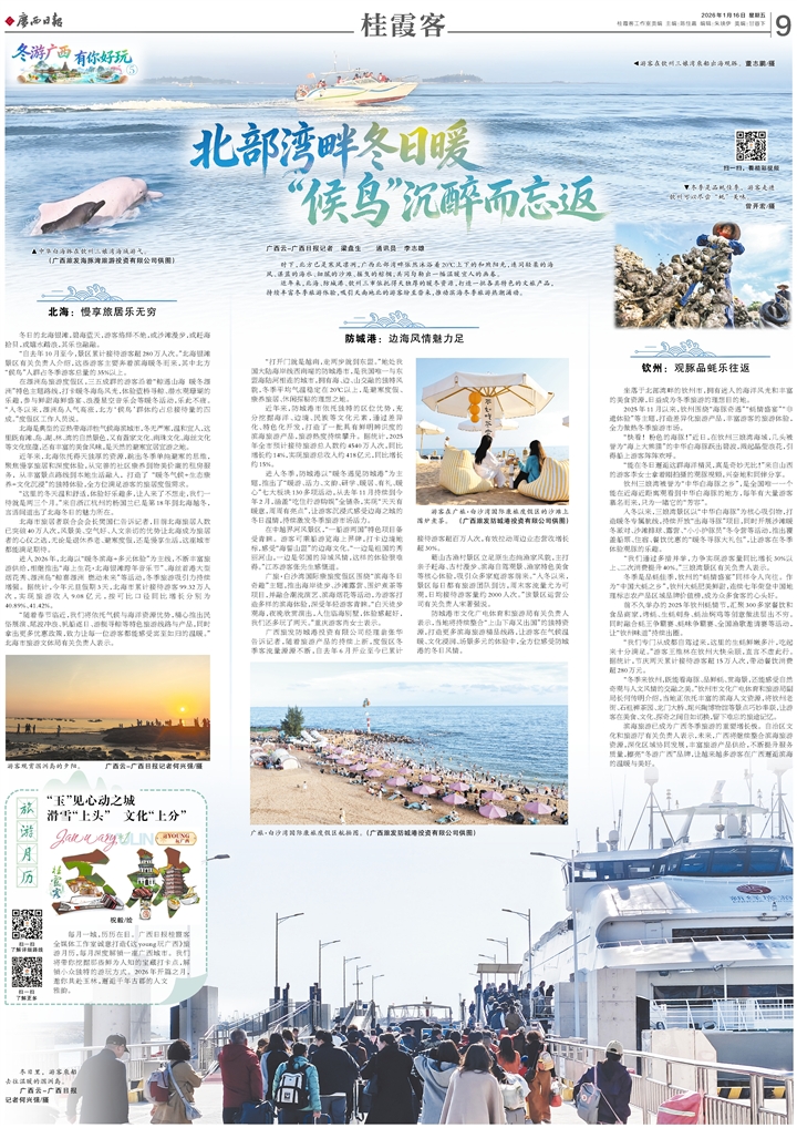 滨海旅游已成为广西冬季旅游的重要增长极。自治区文化和旅游厅有关负责人表示,未来,广西将继续整合滨海旅游资源,深化区域协同发展,丰富旅游产品供给,不断提升服务质量,擦亮“冬游广西”品牌,让越来越多游客在广西邂逅滨海的温暖与美好。