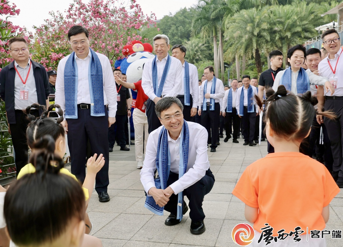 带着一路欢笑,陈刚、韦韬、孙大伟等来到第七单元“果力全开·创客坡”,参观广西+东盟水果市集、潮玩市集等。随后,“艺呼百应”赛歌会在民歌湖大舞台启动,领导嘉宾行进式观看全国“四季村歌”优秀节目展演和惠民文艺演出。当《马上来广西》轻快活力的旋律再次响起,全场应声合唱,齐跳手势舞,歌声、笑声交织,活动的欢乐氛围推向了顶点。
